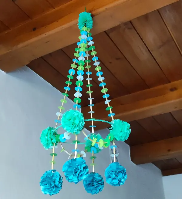 Pająki obręczowe, wykonuje się na kontrukcji metalowej ozdabianej bibułowymi pomponami lub kalinkami.