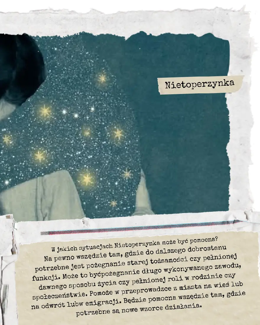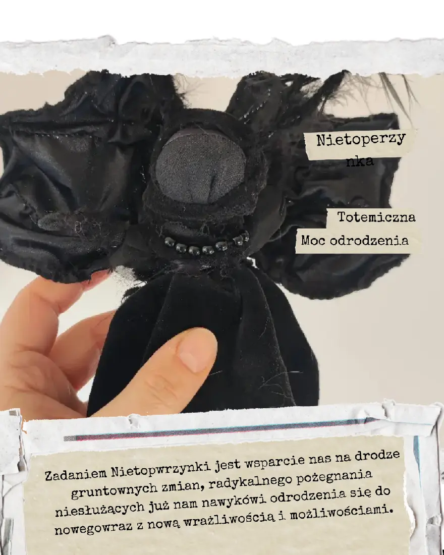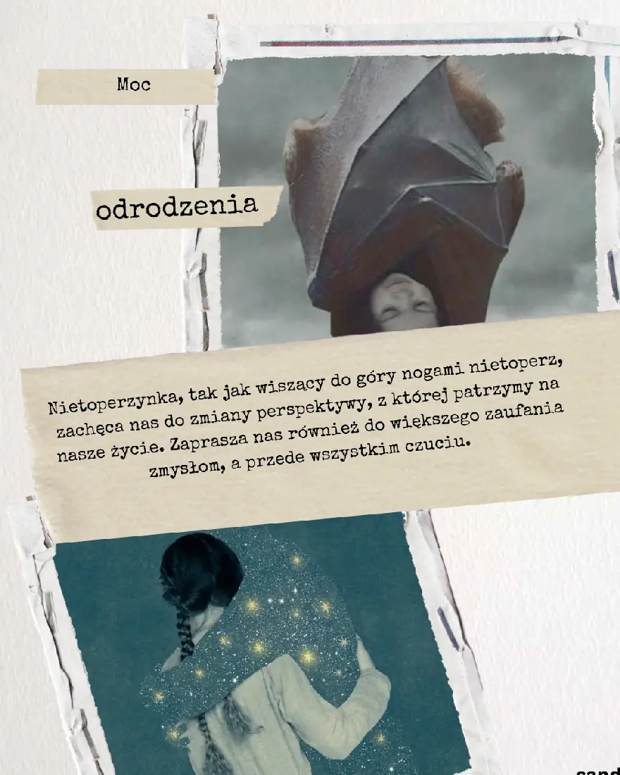 Jakakolwiek radykalna zmiana czeka na Ciebie tuż za progiem, Nietoperzynka wesprze Cię w procesie Rytualnej Śmierci i Ponownego Odrodzenia. Będzie Cię zachęcać do wyczulenia zmysłów na to, co umykało dotąd twojej uwadze. Ułatwi ci odnalezienie nowych ścieżek, pomysłów i sposobów na działanie. Zaprosi do czucia świata wszystkimi zmysłami i zajrzenia pod podszewkę codzienności. Wszystko po to, by to nowe, co odkrywasz, było tworzone z innego niż dotąd wzoru.