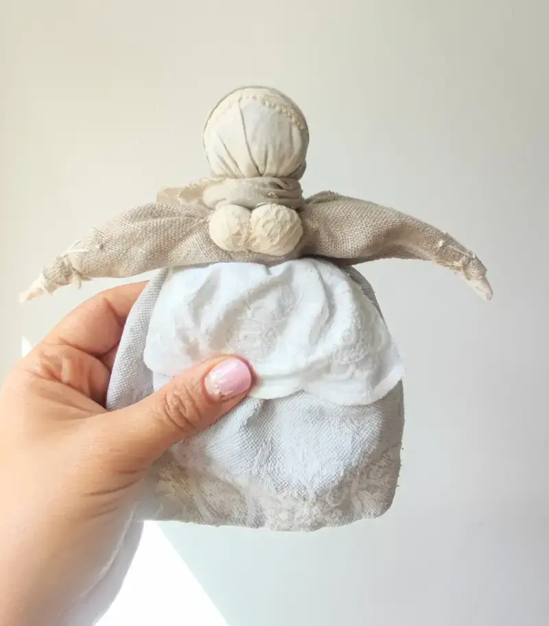 Nowinka cała zamotana jest z surowego lnu oraz białych nici i jasnych koronek. Jej nogi są gotowe do tańczenia Tańca Życia, a wysoko wyciągnięte mocne ramiona trzymają kierunki świata, by ona sama mogła się zatracić w wirowaniu. Ma w sobie trochę łabędziego puchu i delikatność skrzydeł ćmy. Na pierwszy rzut oka widać w niej ufność małego dziecka i energię podrywającego się do lotu ptaka. Jest pełna ekscytacji jak pierwsze strony nowego notesu i radość wiosennego ogrodu po deszczu. Tętni wewnętrznym blaskiem, mówiąc: Jestem Nowym Początkiem.