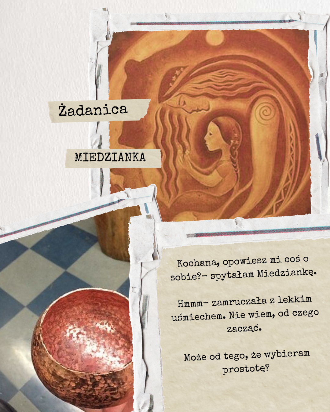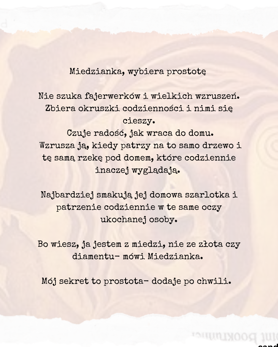 Kochana, opowiesz mi coś o sobie?- spytałam Miedziankę. Siedziała przy długim, drewnianym stole i piła gorącą czekoladę z prostego, glinianego kubka. Wyglądała jednocześnie jak ze skansenu i z okładki modnego magazynu modowego. Jej ubranie i cała ona, mieniła się kolorem dojrzałego kasztana, który dopiero co wyłuskany został z grubej, zielonej skorupy.